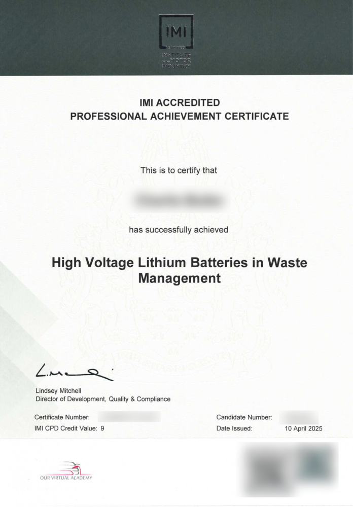Upon successful completion of the course, delegates will receive an IMI Accredited Professional Achievement Certificate in High Voltage Lithium Batteries in Waste Management.